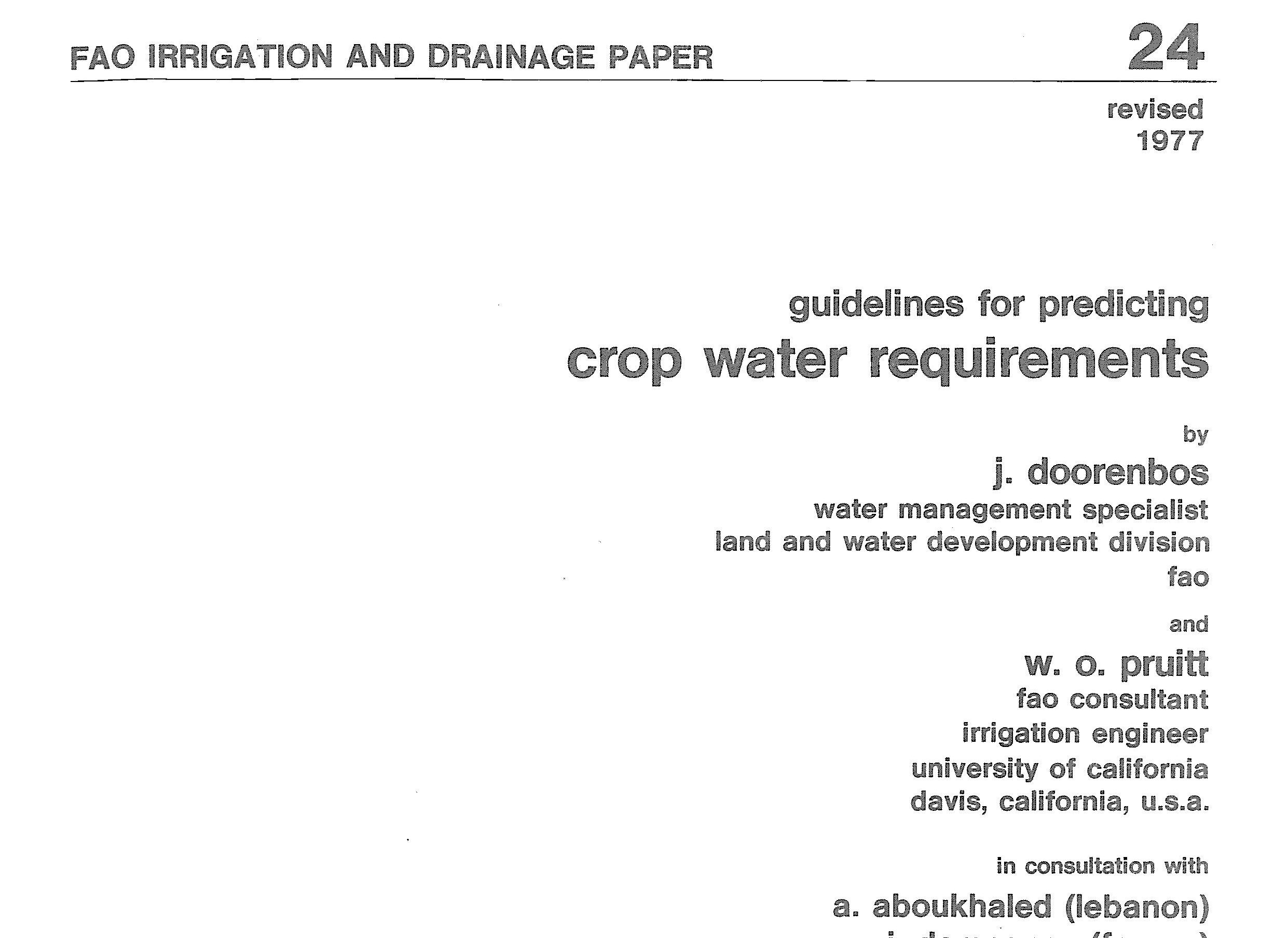 1975年聯合國的「農糧組織」(Food and Agriculture Organization)發表一份報告——「作物需水量」(Crop Water Requirement),作為普世節省用水又兼顧作物產量的準則。這準則也成為待開發國家,向農糧銀行申請經費輔助灌溉設施的依據。這份報告的作者是普魯特(William O. Pruitt, 1922-2009),國際著名的水資源專家。