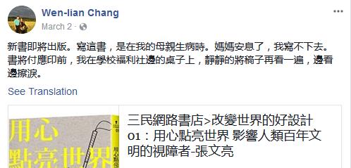 不想看到社会对于视障者的无知,持续荒芜;不想看到 视障者面对学习的困难,太早放弃;不想看到社会对视障者太多的冷漠,太少的温情,因此过去几年,我筹办了视障者的野外学生态游,担任特殊孩童营队的讲员, 也长期地探索视障者的史料。在撰写这本书时,我的母亲癌症末期,我需要照顾她,基于自己有限的体力,只能写作本书中的八位视障者故事。